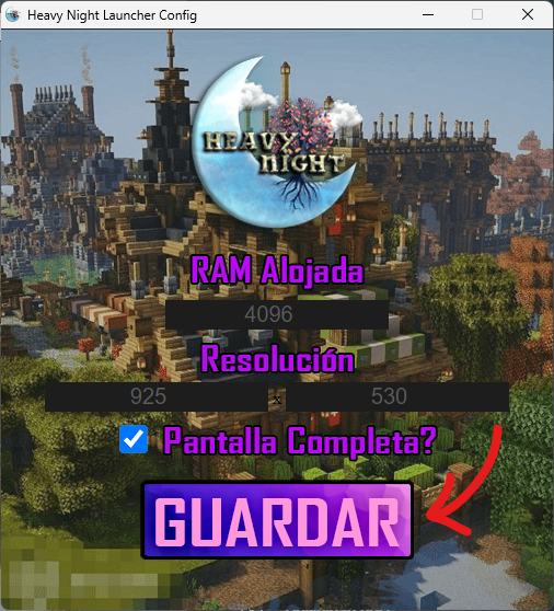 Pueden también configurar la RAM con la que desean iniciar, la resolución y si desean abrir el Minecraft en pantalla completa, dándole a la tuerca que está en la parte inferior derecha. Luego de modificar a su gusto lo que quieran le dan a "Guardar" para aplicar los cambios.